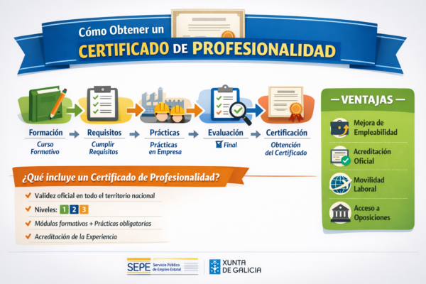 La gran ventaja del nuevo sistema modular en Galicia es que los Certificados Profesionales son acumulables. Si obtienes un certificado (Grado C), puedes capitalizar esos módulos para que te convaliden partes correspondientes de un título de FP completo (Grado D) en el futuro, facilitando tu itinerario formativo