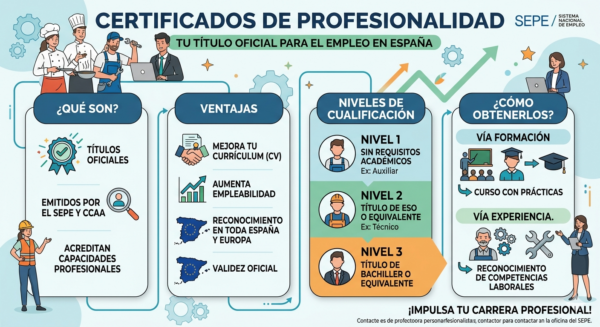 - Reconocimiento: Permite acreditar competencias profesionales adquiridas por experiencia laboral.